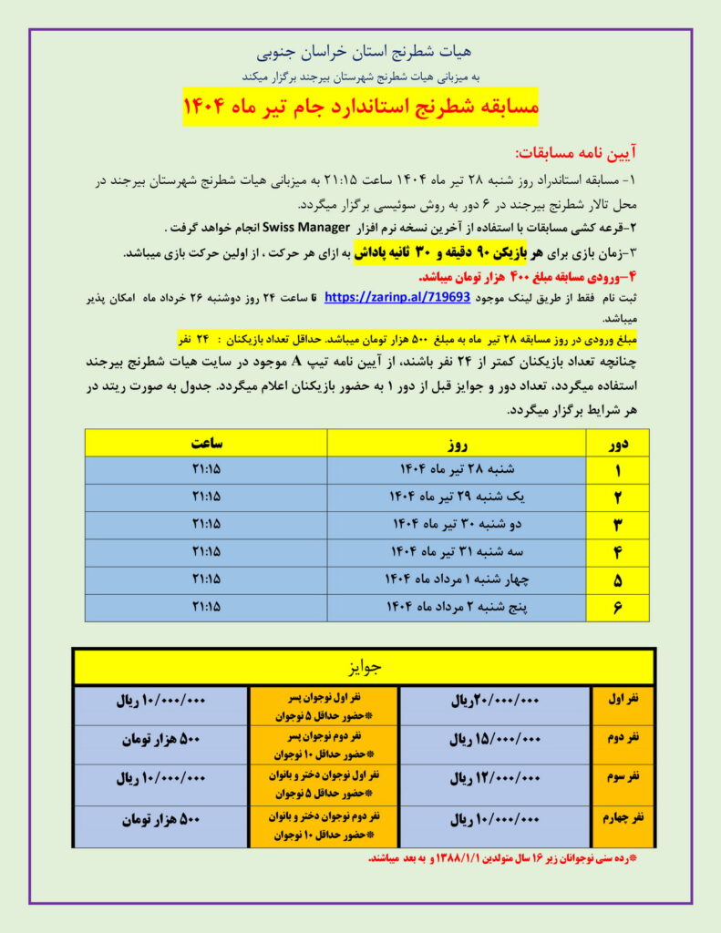مسابقه شطرنج استاندارد جام تیر ماه / شنبه ۲۸ تیر ماه ۱۴۰۴