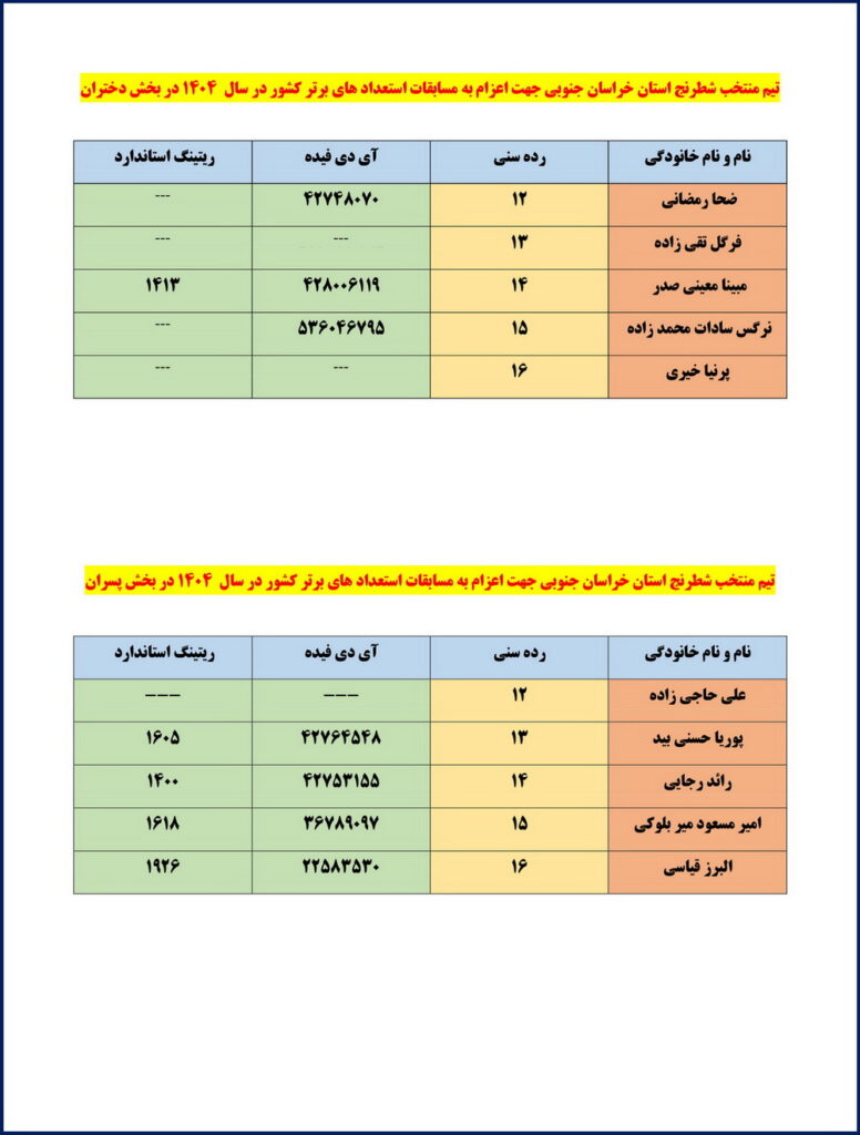 این مسابقات که در ۲ بخش دختران و پسران در روز های ۳و۴ مهر ماه به میزبانی هیات شطرنج شهرستان بیرجند برگزار گردید، بازیکنان منتخب در هر رده سنی موفق شدند تیم شطرنج استان را تشکیل دهند.