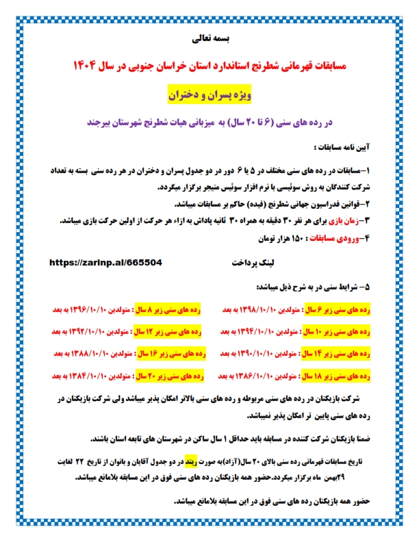 • مسابقه شطرنج استاندارد ریتد قهرمانی استان خراسان جنوبی در سال ۱۴۰۴/ رده سنی آزاد آقایان و بانوان