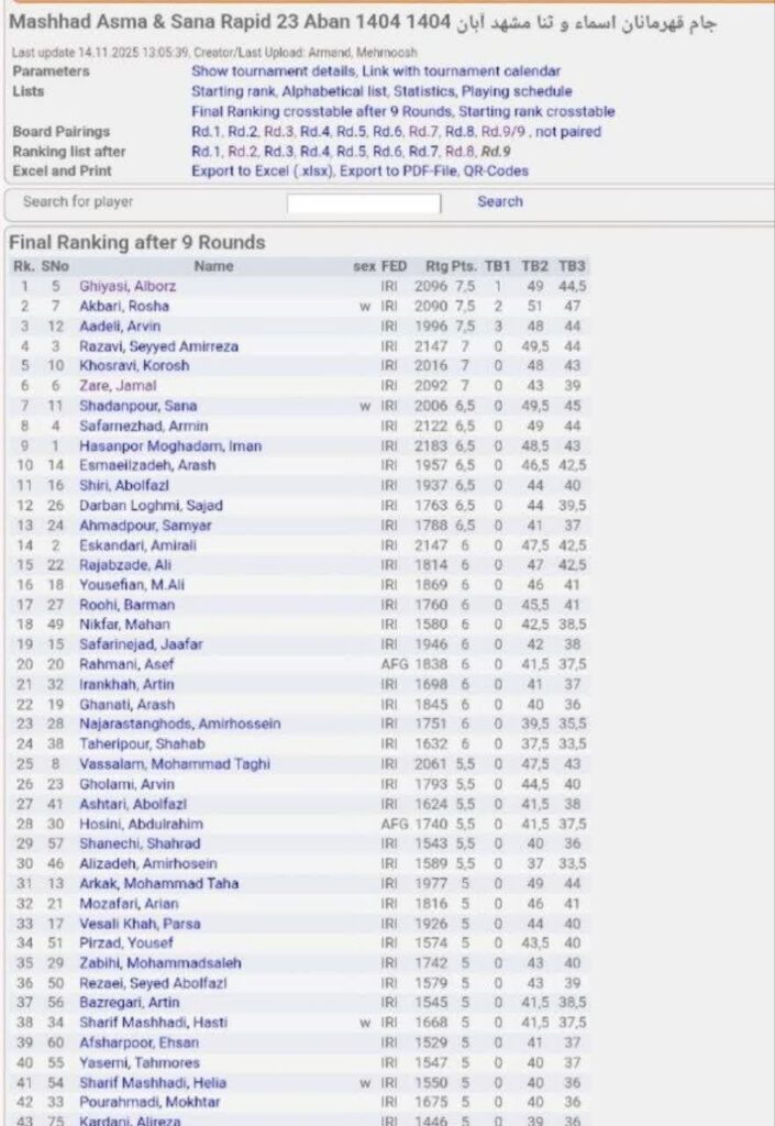 مسابقه رپید ریتد جام قهرمانان ثنا و اسماء مشهد با حضور ۱۰۹ بازیکن در ۹ دور به روش سوئیسی در تاریخ ۲۳ آبان ماه برگزار گردید.
