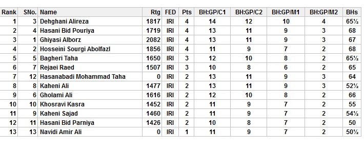 این مسابقه با حضور ۱۳ بازیکن در ۵ دور به روش سوئیسی برگزار و در پایان علیرضا دهقانی ،پوریا حسنی بید و البرز قیاسی به ترتیب جایگاه های اول تا سوم را ازآن خودشان کردند.
